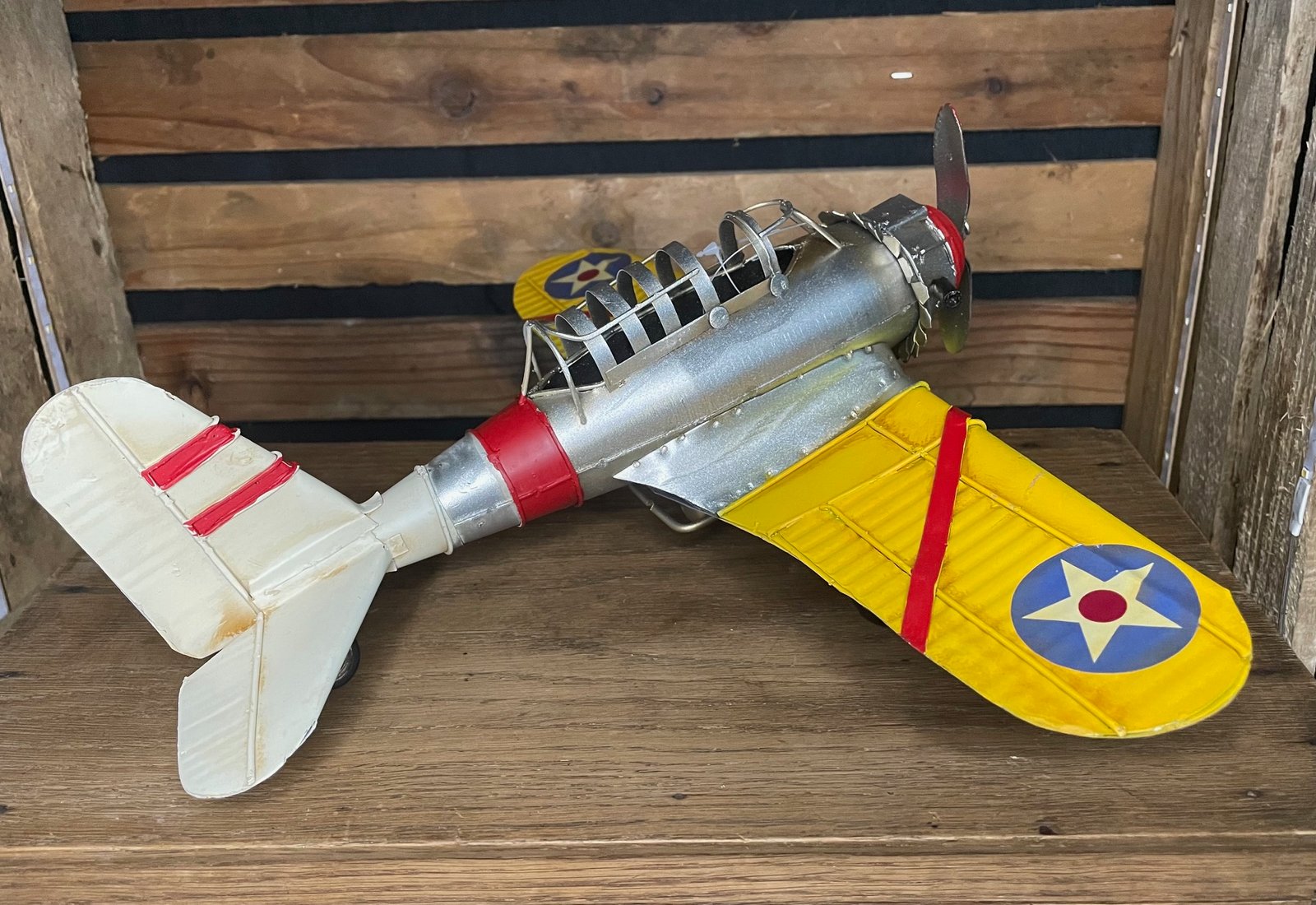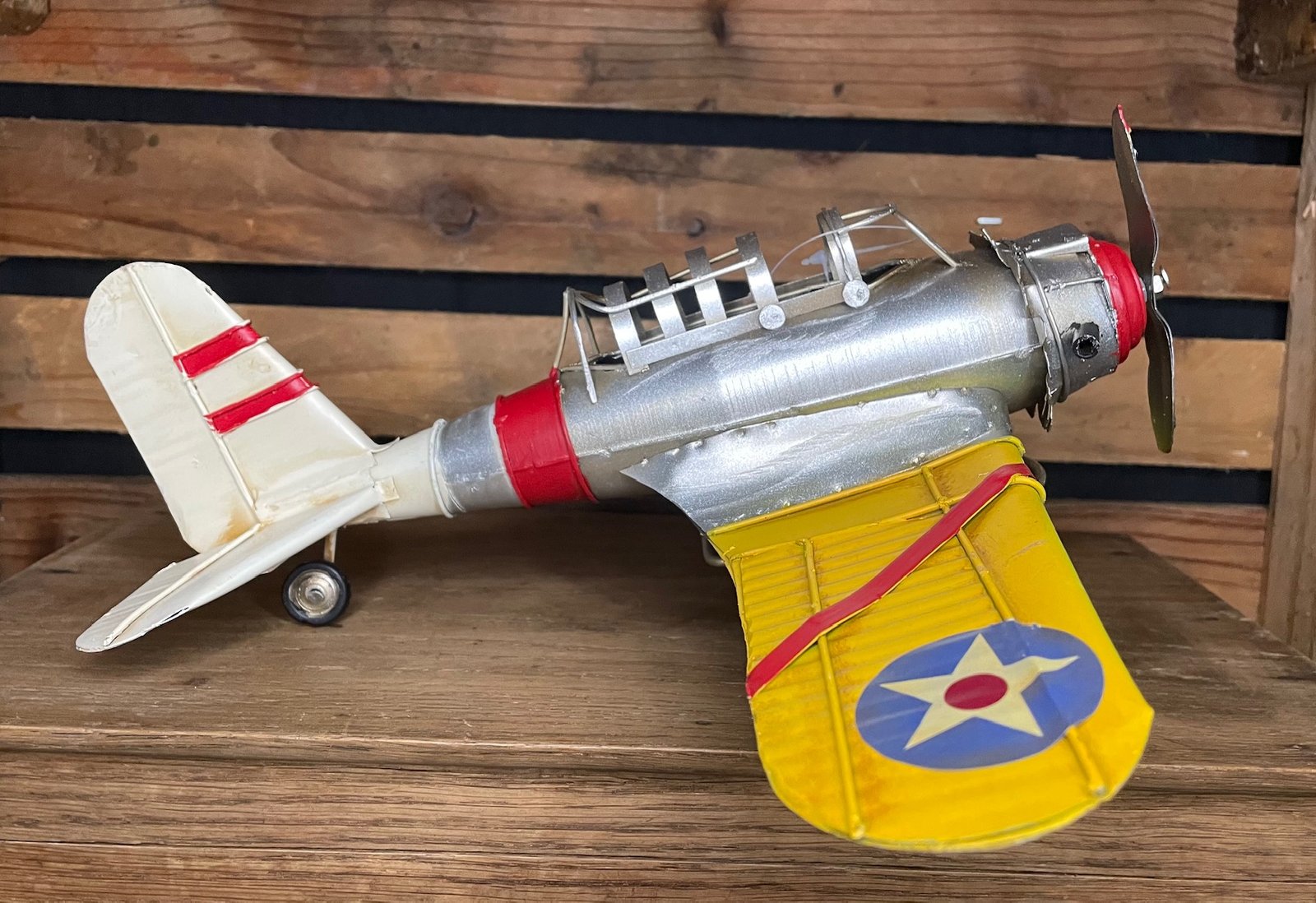 Cet avion en métal des années 1940, avec ses lignes fuselées et son style robuste d’époque, évoque les pionniers de l’aviation et les grandes traversées d’hier. Son design authentique, aux finitions métalliques légèrement vieillies, rappelle le courage, l’ingéniosité et l’aventure qui animaient les premiers vols.