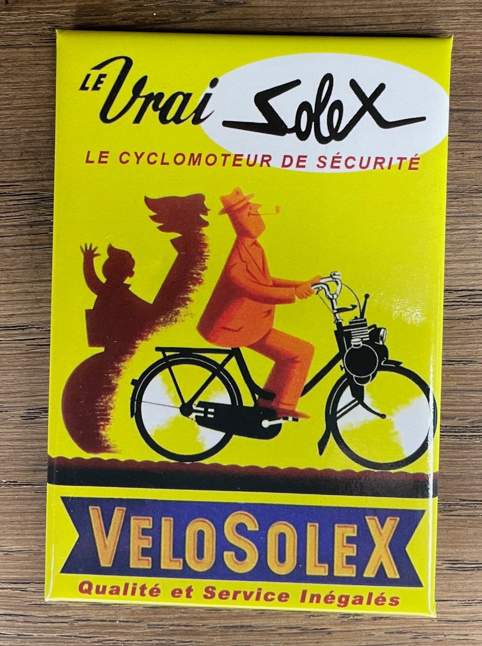 Ce magnet VéloSolex remet en scène la silhouette incontournable du fameux “Solex”, le compagnon fidèle des trajets simples, des virées tranquilles et des matinées fraîches où le moteur ronronnait doucement le long des routes de campagne.