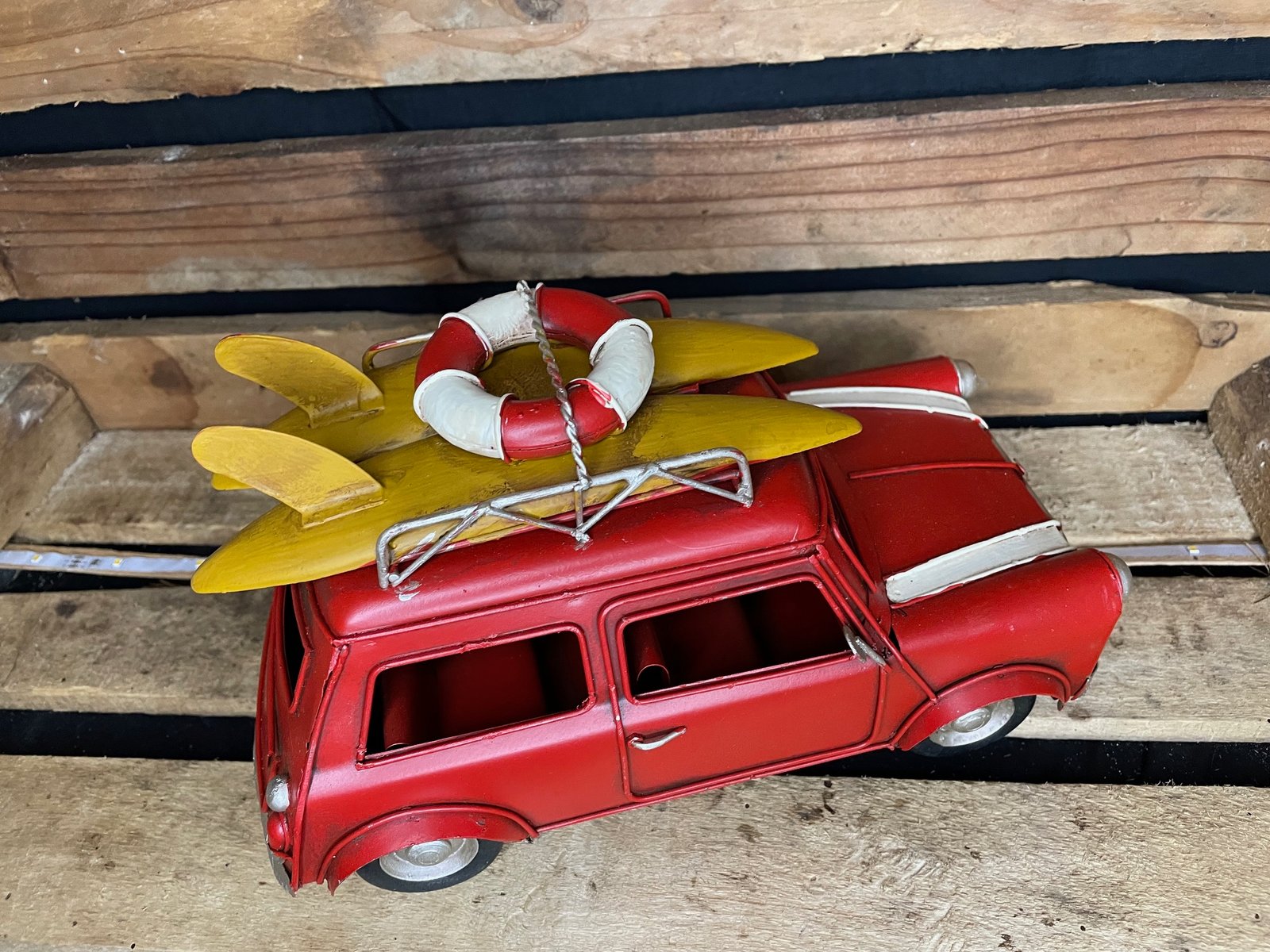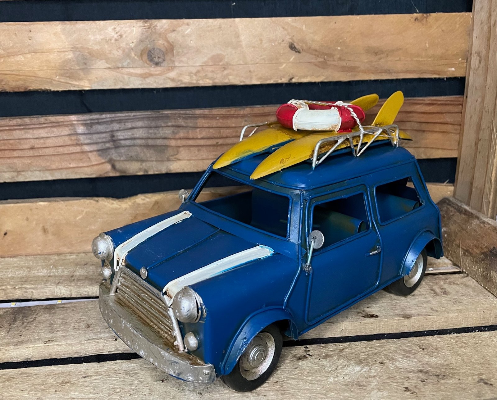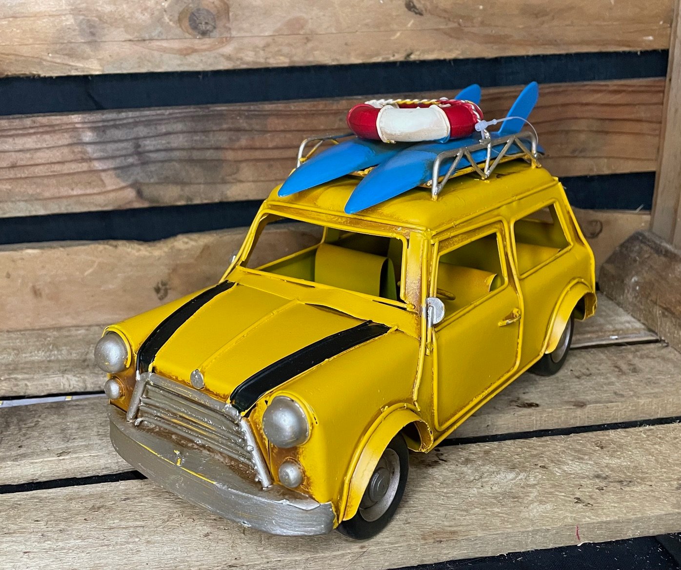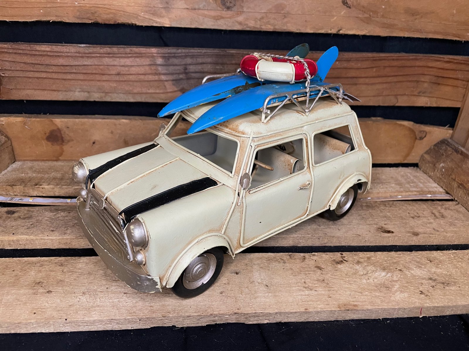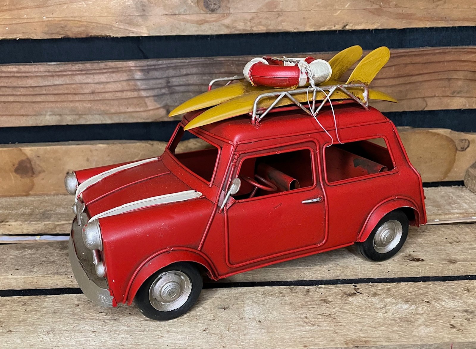 Apportez un souffle de vacances rétro à votre déco avec cette Mini ancienne pleine de charme ! Équipée de sa galerie et de planches de surf sur le toit, elle évoque instantanément l’ambiance des road trips en bord de mer et le style iconique des années d’antan.